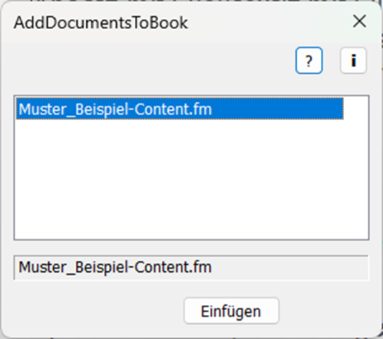 Das Ergebnis ist identisch mit dem Einfügen eines Dokuments über den Dialog im Buchfenster mit Suche nach dem Dokument im Dateisystem.