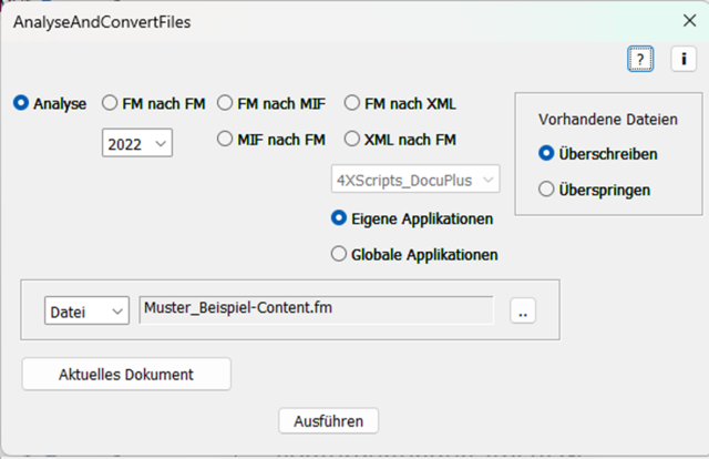 Es ist zusätzlich möglich, zuerst eine Analyse der gewählten Dokumente durchzuführen und darüber einen Report auszugeben.