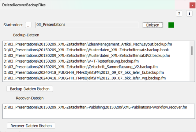 Listet und entfernt alle automatisch erstellten Backup- und Recovery-Dateien im gewählten Ordner inkl. Unterordnern.