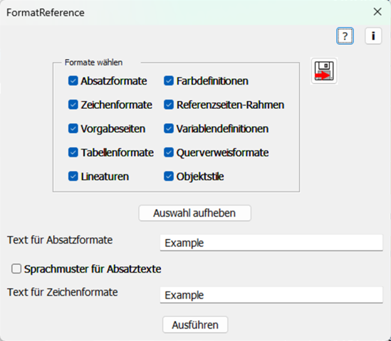 Erstellt eine tabellarische Übersicht mit Beispieltexten über alle Formate und Katalog-Definitionen eines Dokuments und erleichtert so die effiziente Bearbeitung der Formate.