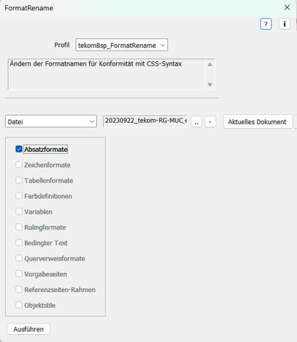 Ermöglicht das gleichzeitige Umbenennen von mehreren Formaten in einem oder in mehreren Dokumenten. Dazu werden in einem Master-Dokument die neuen Formate eingerichtet und im Konfigurations-Dialog den Formaten der zu bearbeitenden Dokumente zugeordnet. Die Konfiguration wird in einer Profildatei gespeichert.
