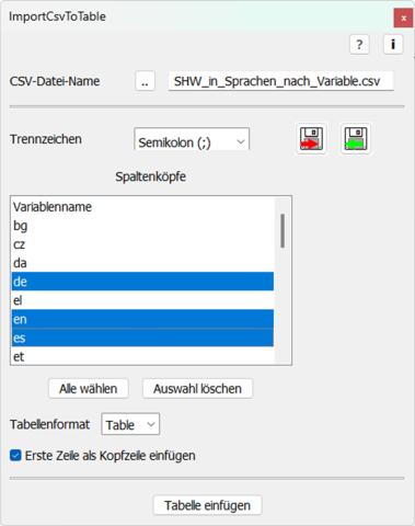 Wandelt beim Datenimport eine *.csv-Datei in eine FrameMaker-Tabelle um.